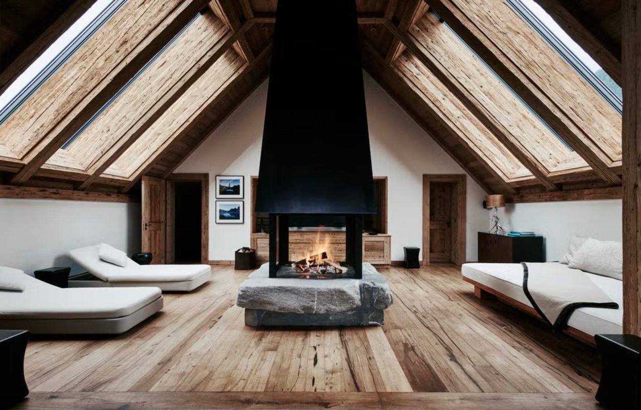 Cuando hablamos de hoteles de esquí, hay un sistema de niveles tácito, y el de 56 habitaciones Alpina Gstaad está en lo más alto. Diseñado por los arquitectos Jaggi y Partner AG, rezuma grandeza moderna. Sus interiores combinan materiales locales como madera envejecida y piedra tallada a mano, una visión realizada por los diseñadores de interiores HBA. El estudio adoptó una estética decididamente alpina con muebles modernos de estilo internacional, muchos de ellos procedentes de B&B Italia. Un punto focal importante de la propiedad es una casa desmontable antigua del arquitecto francés de mediados de siglo Jean Prouvé instalada en el jardín. El Six Senses Spa es un paraíso subterráneo donde la luz natural se filtra suavemente. Y para llegar a la colina, la flota de vehículos con chofer de Alpina garantiza una transición elegante a la red de ascensores interconectados de Gstaad.