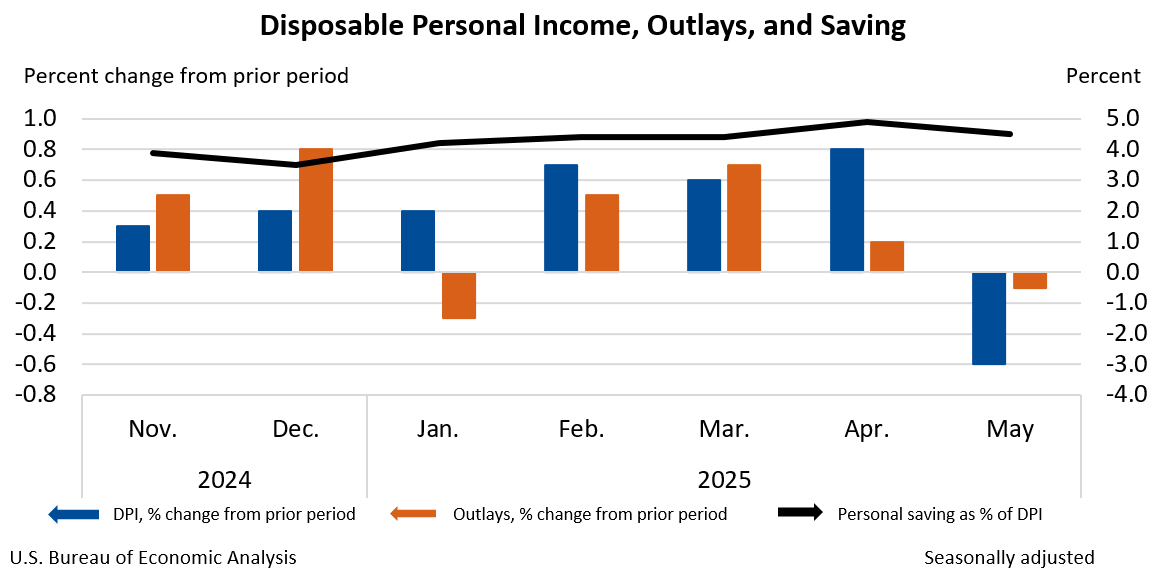 Gastos personales– Los resultados totales del pago personal de PCE y la transferencia actual – disminuyeron 27.6 mil millones de dólares en mayo Ahorros personales Cuesta $ 1.01 billones en mayo y Tasa de ahorro personal– Los ahorros personales son el porcentaje de ingresos personales que se utiliza para el 4.5 por ciento.