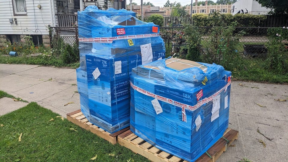 Decidí dar el salto y pedir un sistema de bomba de calor DIY Mr. Cool a un distribuidor en línea el verano pasado. El costo total de dos unidades exteriores y cinco unidades interiores es de $6500, lo que representa un ahorro significativo. Aunque gastamos $2,000 adicionales en asistencia laboral y algunas piezas. El sistema llegó en una caja sobre un palet grande a mediados de agosto.