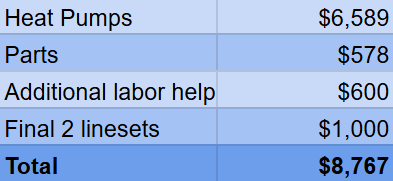 Lo positivo es que aprendí mucho sobre las bombas de calor. y ahorró alrededor de $7,000 en la instalación. El costo total de mi proyecto fue de $8,767 (sin incluir mi tiempo) para un buen sistema que fuera limpio y eficiente.
