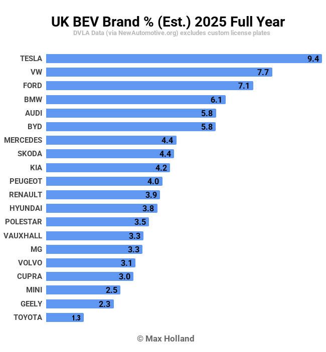 Durante todo el año 2025, Tesla fue la marca líder de BEV con una participación de mercado del 9,4%, seguida por Volkswagen (7,7% de participación) y Ford en tercer lugar (7,1% de participación).