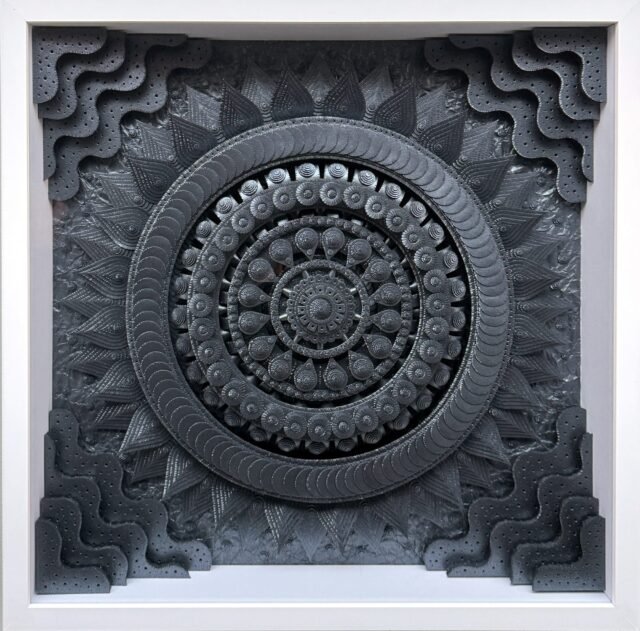 De papel recubierto de metal cortado, con muescas, poroso y en capas. Michael Welliquette Crea fascinantes patrones geométricos. Es conocido por su composición similar a un mandala, que a veces se eleva como una torre o parece girar con múltiples niveles circulares. Todavía está explorando “El sutil paisaje del interior”, dice el comunicado de su nuevo espectáculo.