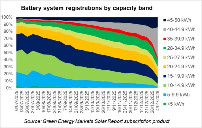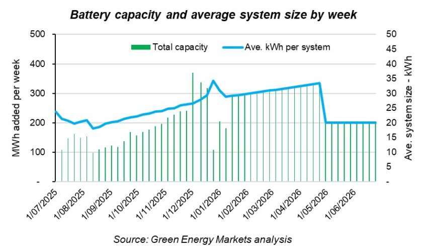En términos de lo que significa para la capacidad de almacenamiento, el tamaño promedio de las baterías instaladas ha aumentado aproximadamente un 1,7% por semana desde agosto. y ahora es de hasta 29 kilovatios hora.