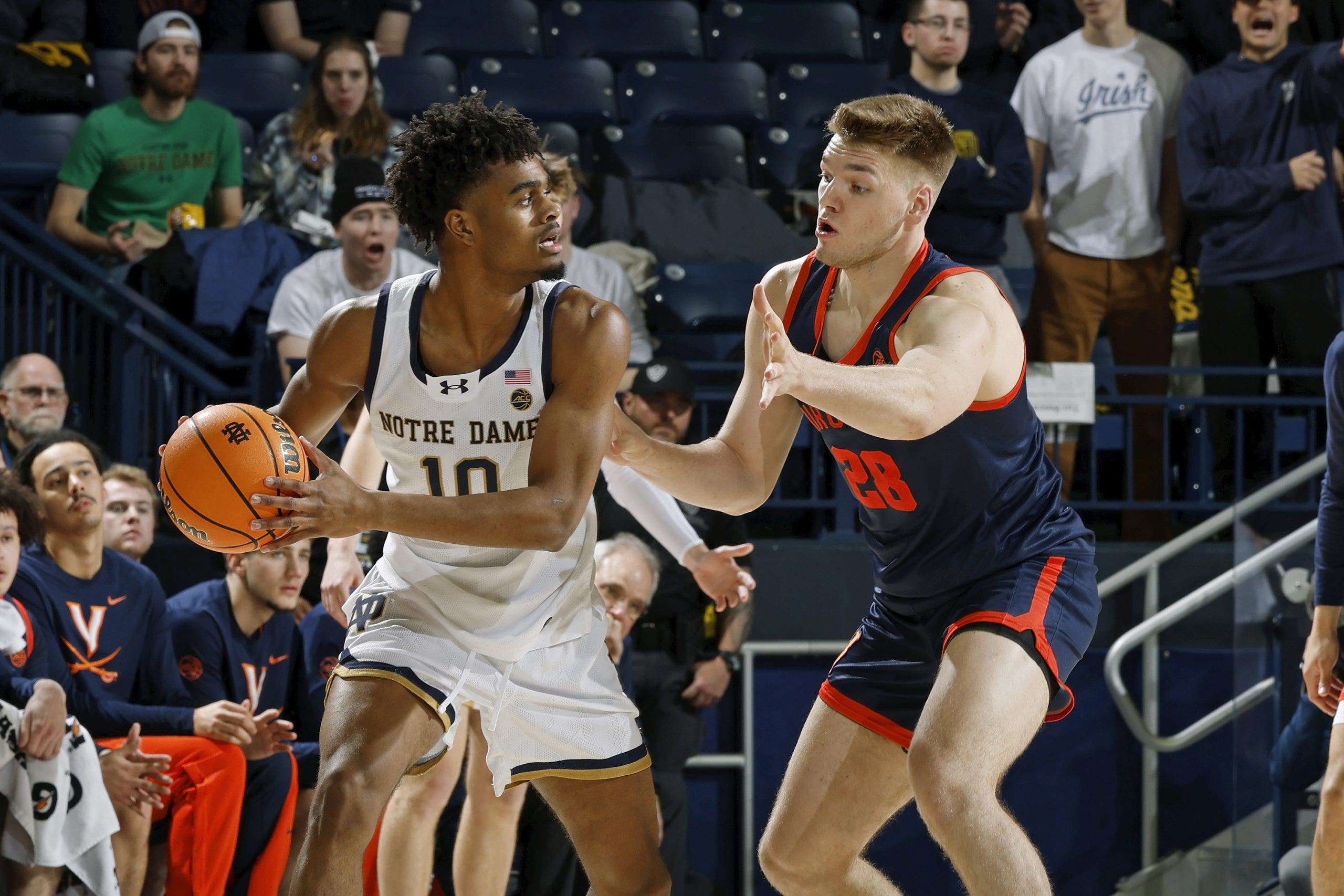 SOUTH BEND, IN – 27 DE ENERO: Jalen Haralson (10) de Notre Dame Fighting Irish maneja el balón mientras está protegido por Thijs De Ridder (28) de los Virginia Cavaliers durante un partido de baloncesto universitario el 27 de enero de 2026 en Purcell Pavilion en South Bend, Indiana. (Foto de Joe Robbins/Sportswire Icon vía Getty Images)