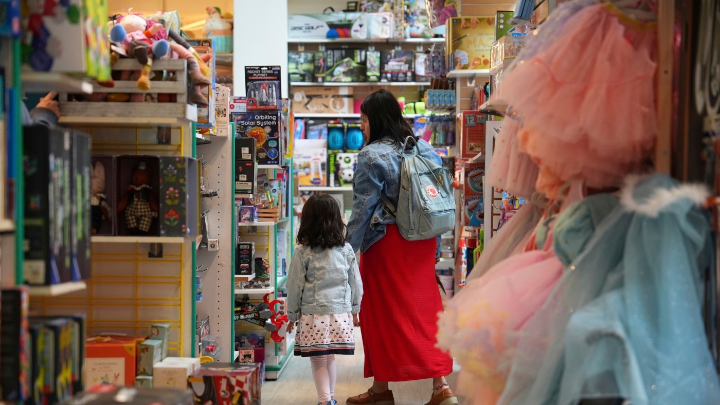 Una familia en una juguetería en Princeton, NJ