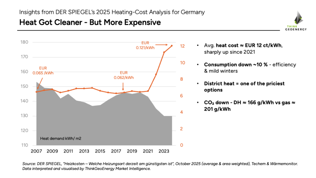 Análisis según DER SPIEGEL (octubre de 2025)Costes de calefacción: ¿qué tipo de calefacción es actualmente más barata?” (detrás de un muro de pago) Gráficos e interpretaciones de ThinkGeoEnergy Market Intelligence