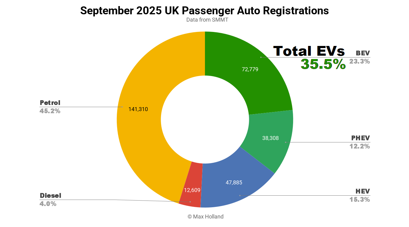 En los totales de ventas de septiembre, los vehículos eléctricos enchufables combinados coparon el 35,5% del mercado automovilístico del Reino Unido, los totalmente eléctricos (BEV) el 23,3% y los híbridos enchufables (PHEV) el 12,2%. Estos se comparan con acciones interanuales del 29,4% combinado, el 20,5% BEV y el 8,9% PHEV.