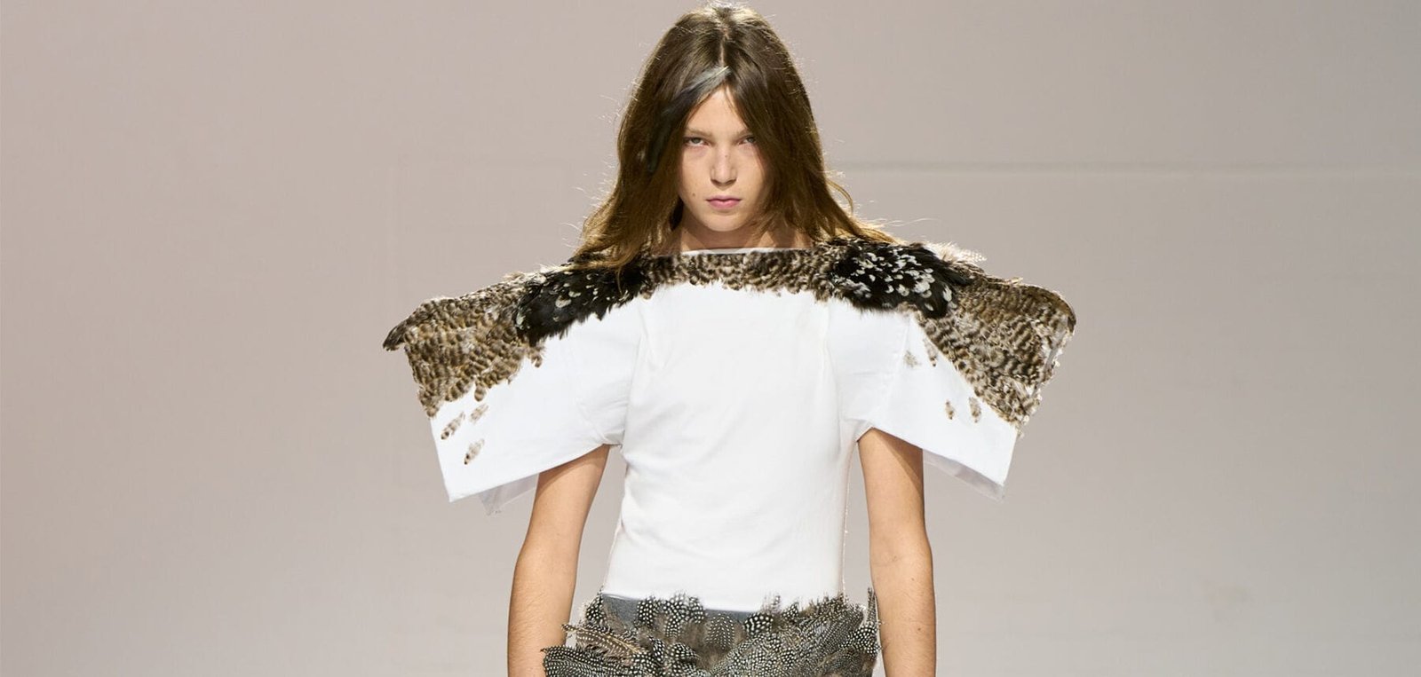 Para el desfile de modas debut de Ouyang, el artista Gary Card cubrió la pasarela en un mar de cartas y notas (66 metros, para ser exactos). Ouyang llamó al programa Don’t Shoot The Messenger, basado en la historia imaginaria de un viaje de caza medieval. Había obtenido plumas de pollo y pavo, todos subproductos de la industria de la carne, para decorar sus diseños. Manos a mano a pantalones cortos, zapatos y a los hombros de camisetas como pequeñas alas, sus protagonistas de pasarela parecían decorarse en las plumas como si fueran insignias de honor de su salvaje excursión.