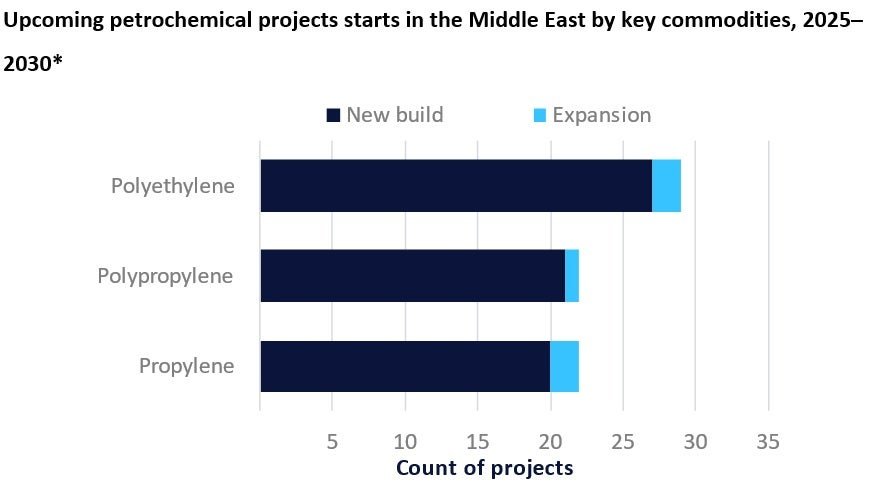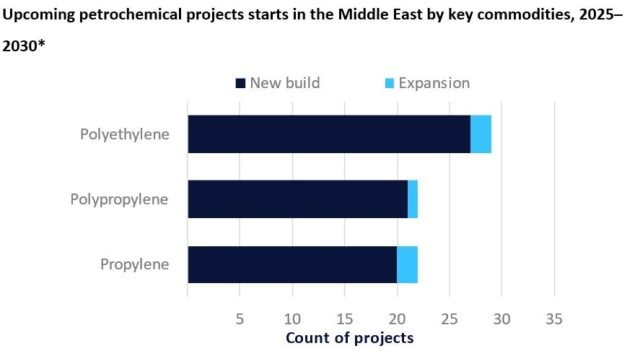 Se espera que el polietileno esté a la vanguardia en términos de inicio de proyectos petroquímicos en Medio Oriente, con 29 proyectos que entrarán en operación durante el período de perspectivas 2025-2030. La mayoría de estos proyectos son construcciones nuevas, y solo dos proyectos se ampliarán. Irán está listo para tomar la iniciativa en el lanzamiento del proyecto de la región. Esto representa aproximadamente el 70% de los próximos proyectos de polietileno para 2030, todos ellos de nueva construcción y en su mayoría en construcción. Se espera que los Emiratos Árabes Unidos hagan lo mismo. Hay cuatro proyectos, todos los cuales se encuentran actualmente en construcción.