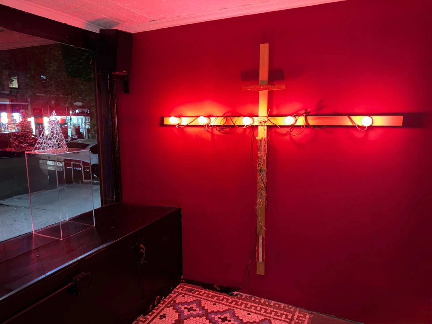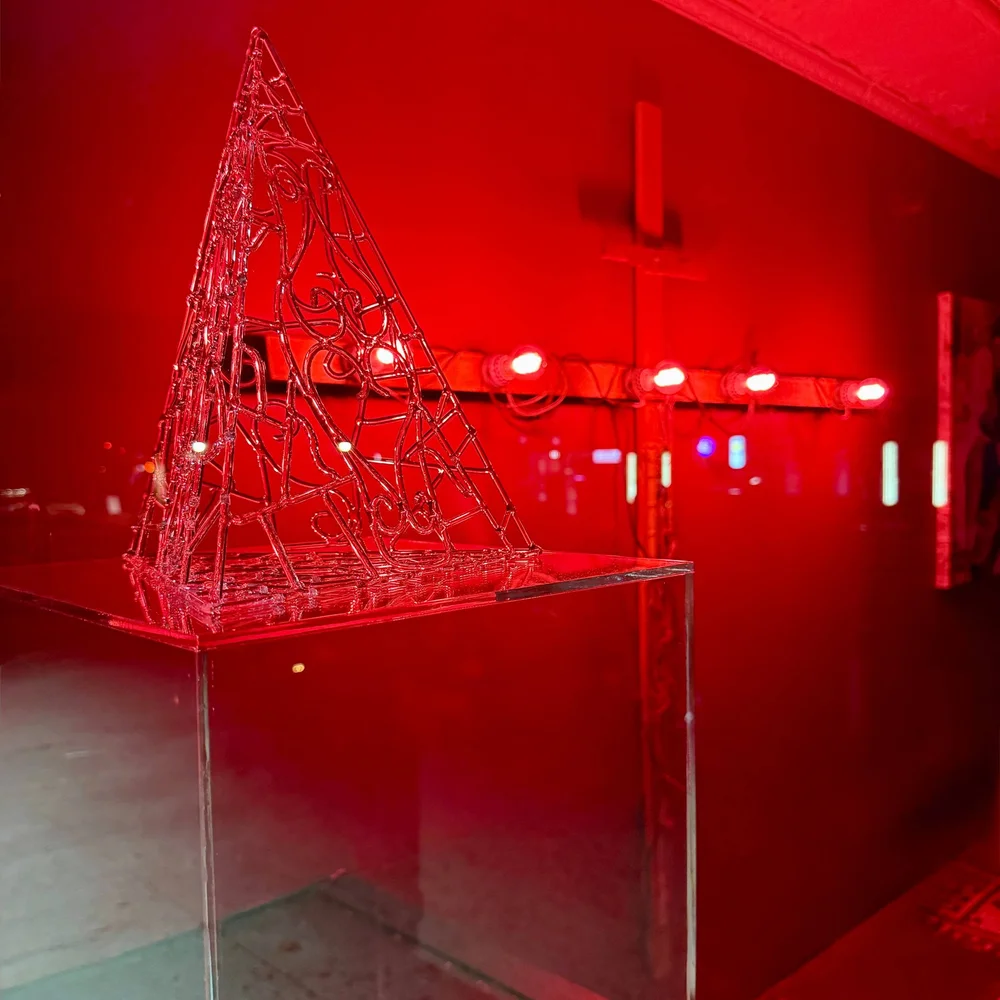 Raúl de Nieves escenifica el color como resurrección. Sus mundos con cuentas y cuerpos con lentejuelas recuerdan tanto a la iglesia como al club, la devoción sagrada y el espectáculo erótico. Adrienne Greenblatt convierte la luz en un umbral. Sus imágenes oscilan entre la aparición y la encarnación, donde la mirada femenina muta en algo espectral pero soberano. Jake Latakas Orrall convierte el sonido en objeto, esculpiendo ecos que vibran en la habitación, dando forma a frecuencias que Vega alguna vez alimentó con distorsión y pulso.