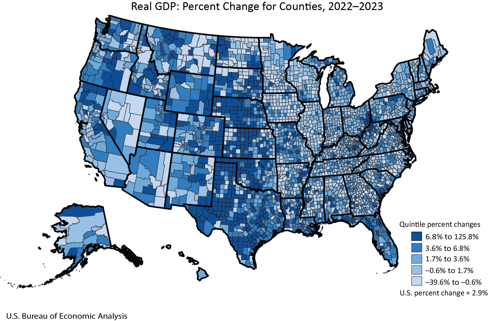 Productos de masa de país reales (PIB) Aumentó en 2,357 provincias, disminuyó en 734 provincias y sin cambios en 23 provincias en 2023, según las estimaciones publicadas por la Oficina de Análisis Económico de los Estados Unidos. El cambio del PIB real es entre el 125.8 por ciento en el área. Throckmorton, TX, –39.6 por ciento en el condado de Lincoln, WA (Tabla 1)