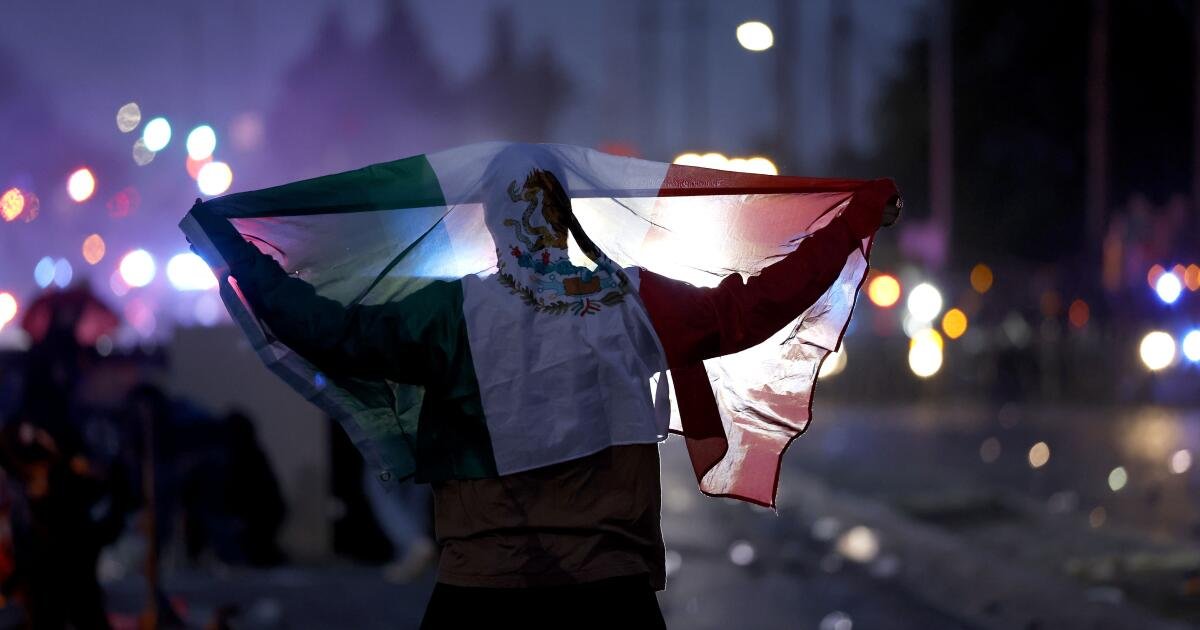 Un manifestante lleva una bandera mexicana mientras los agentes del sheriff del condado de Los Ángeles forman una línea de aplicación de la ley.