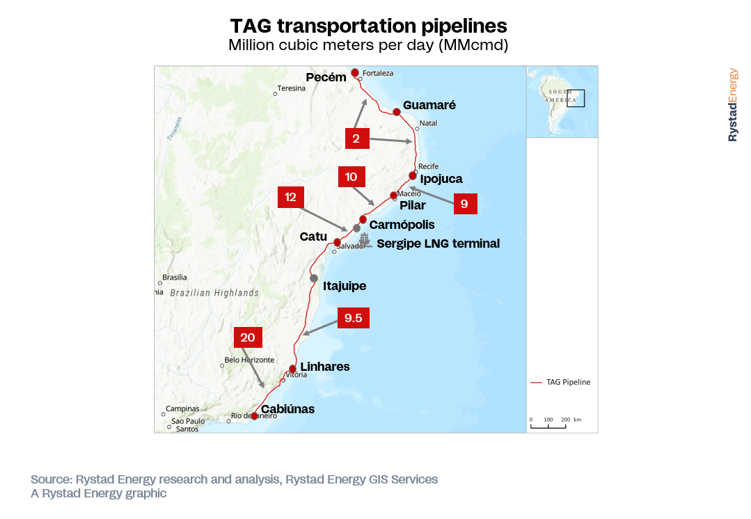 TAG es un operador de gas responsable del principal corredor de transporte que conecta Cabiunas, Brasil (Punto 1), el mayor punto de inyección de gas del país. Ubicado desde Río de Janeiro hasta Ceará (Punto O), TAG desempeñará un papel clave en la integración de nuevos suministros nacionales de gas desde el proyecto de aguas profundas de Sergipe Alagoas (SEAP), puntos de entrada de gas natural licuado (GNL) y centros de demanda en las regiones sureste y noreste de Brasil.