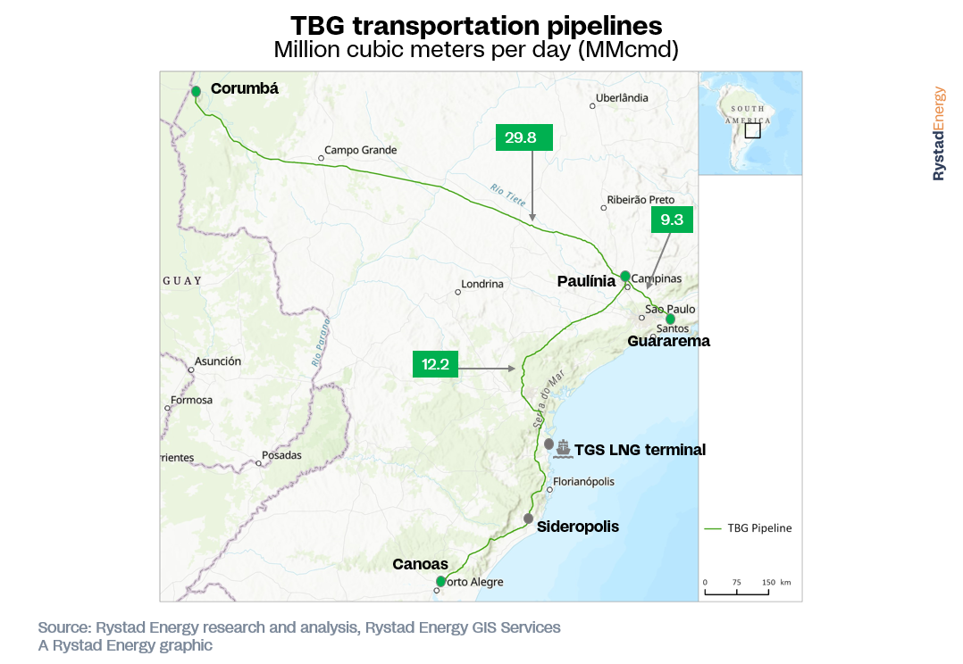 Sin embargo, el retiro de la unidad de conversión de gas de New Fortress Energy de Terminal Gas Sul ha reducido las opciones de inyección de GNL. Con las importaciones de Bolivia cayendo a 10-14 MMcmd en 2025 y las importaciones de Argentina limitadas a 0,4 MMcmd/mes, las fuentes alternativas no son suficientes para cerrar la brecha de oferta.