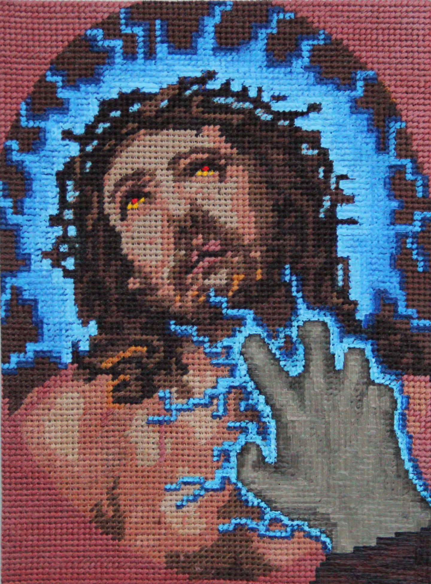 Vojtěch evolucionó este estilo a medida que avanzaba hacia lo que él llama “imágenes bordadas”, utilizando la estética idílica de Cross Stitch, un proceso textil contemplativo, luego “interrumpiendo por completo el entorno pacífico” con imágenes impactantes, del tipo que indignó a los padres en el escéptico de los medios de comunicación de los 90. “Para mí, la imagen del resultado es una especie de captura de pantalla nostálgica que combina la infancia que pasé en un juego con algunas vibraciones de núcleo de abuela”, dice Vojtěch. Su trabajo expone la idea de un choque generacional: las imágenes juveniles y vulgares de escopetas, monstruos, un electrocutado de Jesús y golpes de stitfork, con la calma de los lienzos bordados regimentados e inofensivos. “Es necesario que yo use el bordado existente que tenga una historia, se creó en algún lugar en el pasado, descolorido, a veces descolorido, no deseado”, agrega Vojtěch.