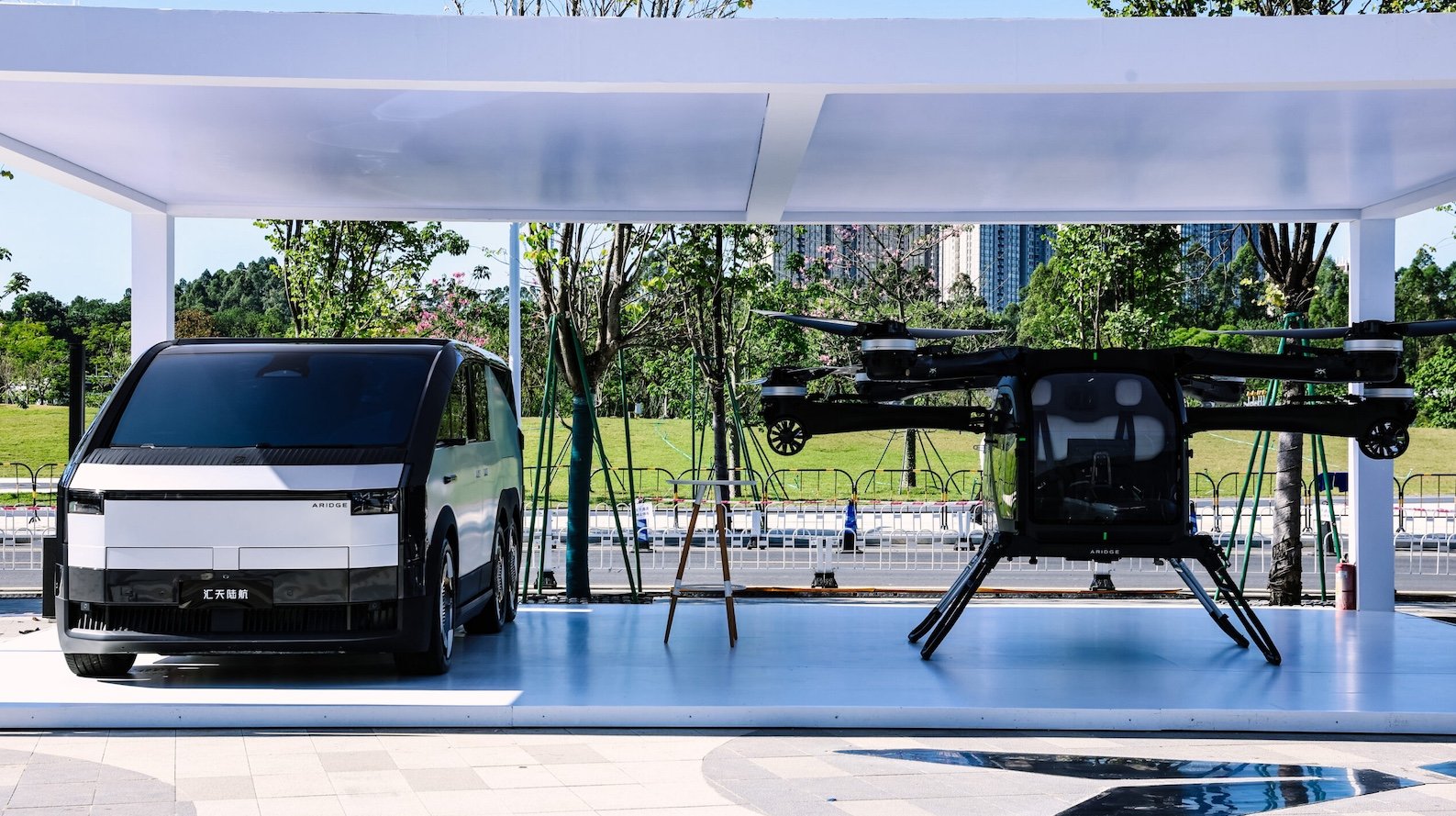 El XPENG Flying Car y el Land Carrier (oficialmente Land Aircraft Carrier). Foto de XPENG.