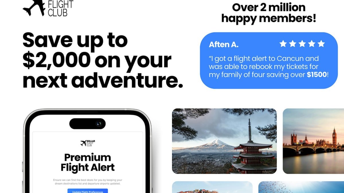 Ahorre grande en viajes durante todo el año con esto Suscripción de 1 año al plan premium de Dollar Flight Clubahora por solo $ 9.99 (Reg. $ 69).