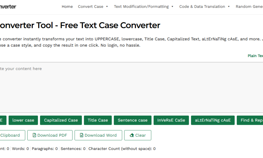 Caseconverter.tools: una página de inicio limpia, interfaz sin registro que permite a los usuarios formatear y peinar texto al instante.