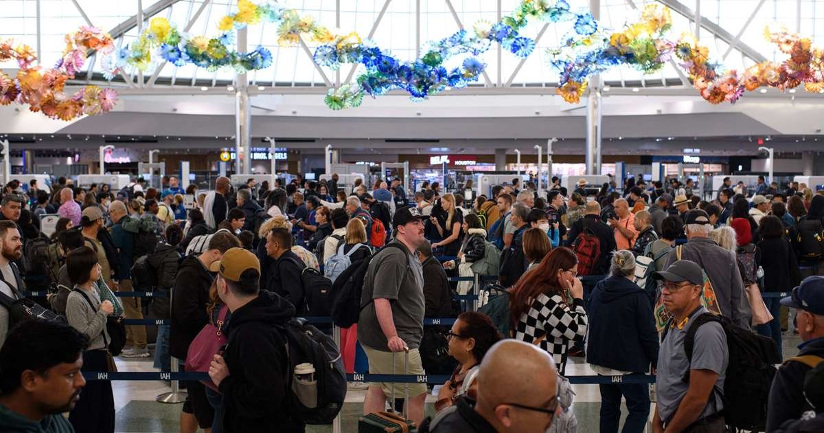 Los viajeros esperan en fila en un puesto de control de la TSA en el Aeropuerto Intercontinental George Bush en Houston el 9 de noviembre. (Mark Felix/Bloomberg)