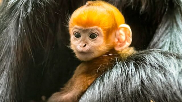 Un HERMOSO y raro mono de color naranja brillante ha nacido en el zoológico más grande del Reino Unido.