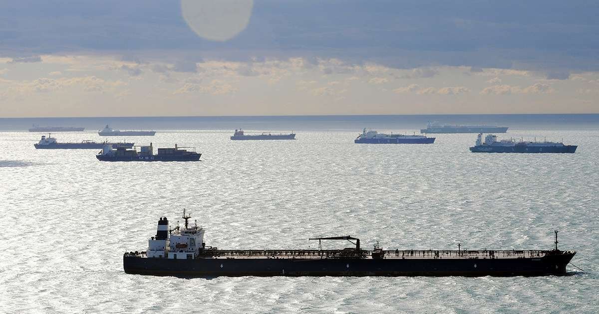 Petroleros y otros barcos esperan en el mar en el puerto de Marsella, en Martigues, Francia. (Anne-Christine Poujoulat/Bloomberg)