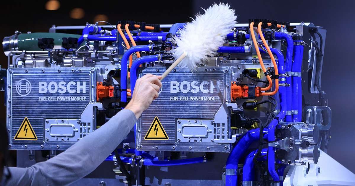 Un trabajador desempolva un módulo de energía de pila de combustible en el stand de Robert Bosch GmbH en la feria de transporte IAA en Hannover, Alemania. (Krisztian Bocsi/Bloomberg News)