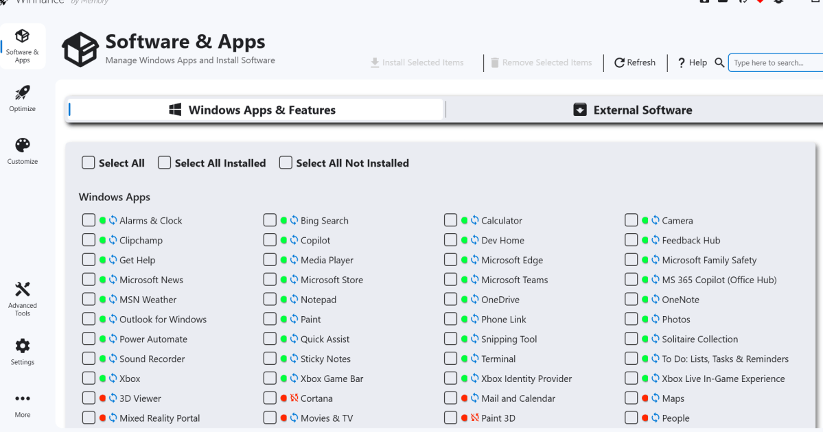 Esto está destruyendo las aplicaciones de Windows. Pero ¿qué pasa con las aplicaciones externas? Bueno, si haces clic en el Software externo En la pestaña en el lado derecho de la ventana verá todo el software externo cargado en su PC. Nuevamente, puede optar por desinstalar o instalar aplicaciones simplemente marcando las casillas y seleccionando Desinstalar elementos seleccionados o Instalar elementos seleccionados.