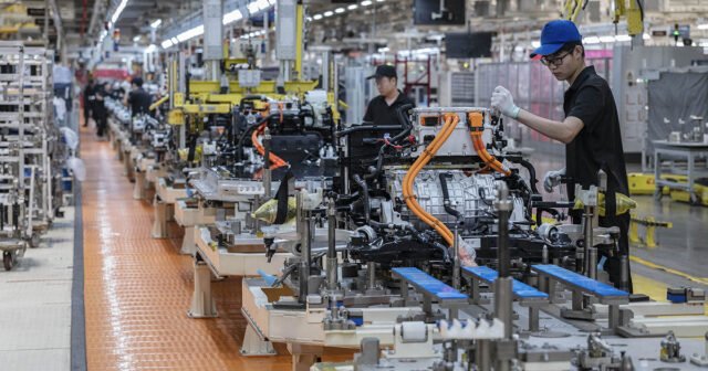 Un trabajador ensambla piezas de vehículos en la línea de producción de vehículos eléctricos en una fábrica en Ningbo, China. (Kevin Frayer/Getty Images)