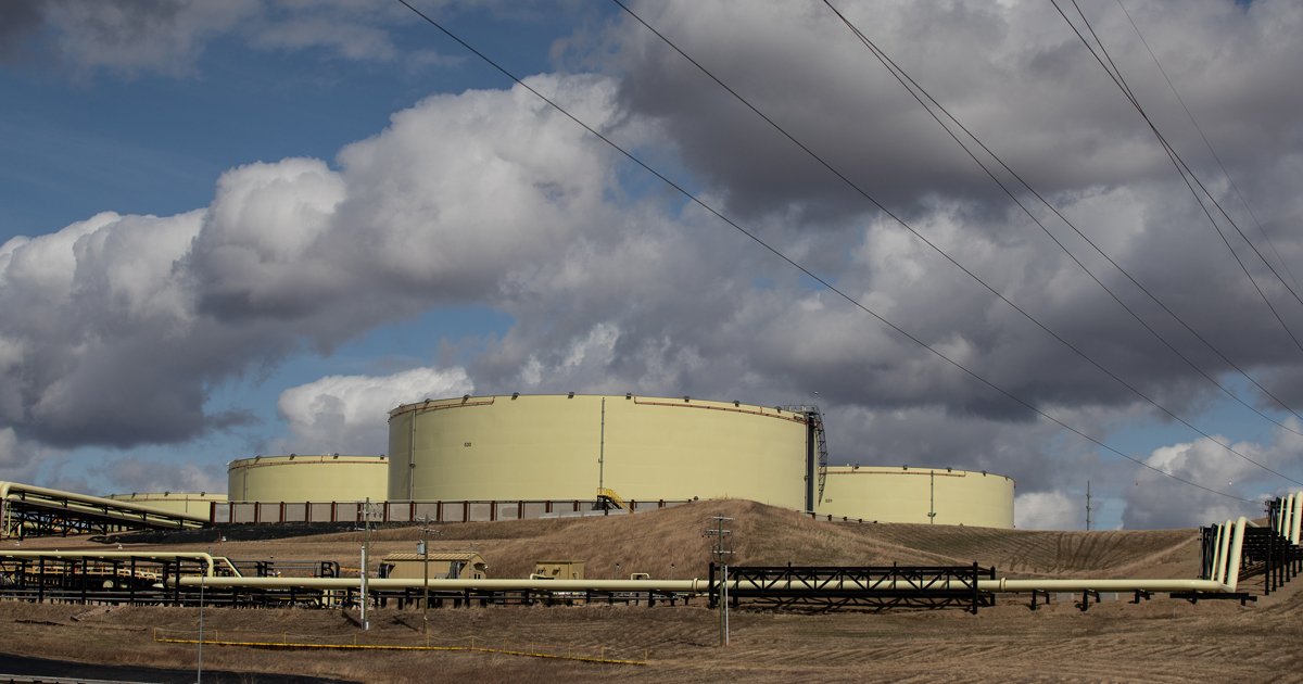 Contenedores de almacenamiento de petróleo y oleoductos en una terminal petrolera en Alberta, Canadá. (Jason Franson/Bloomberg)