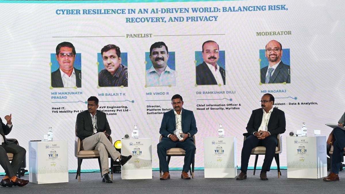 Manjunath Prasad, director (TI), TVS Mobility Pvt. Limitado. Limitado.; Balaji TK, vicepresidente adjunto de ingeniería, Epimoney Pvt. Limitado. Ltd., Préstamos Flexi; Vinod R., Director de Soluciones de Plataforma, Sutherland; Ramkumar Dilli, director de información y jefe de seguridad de Myridius; y N. Nagaraj, vicepresidente de datos y análisis, VIT y El hindú Cumbre tecnológica el jueves. | Crédito de la foto: M. SRINATH