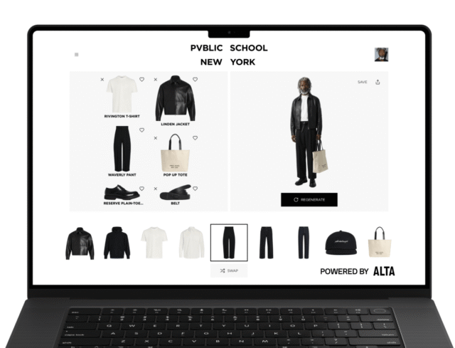 Wang dijo que este es uno de los primeros casos de un diseñador que incorpora un avatar personal y tecnología de estilo en su propio sitio web. Cerca de la parte inferior de la página del producto Escuela pública, hay un ícono que dice Estilo de Alta. Al hacer clic, el cliente accede a Alta para diseñar sus avatares y probar cómo les quedaría la ropa de la escuela pública si la compraran.