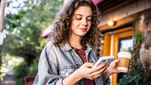 Una mujer joven con cabello castaño rizado, vestida con una chaqueta vaquera y una blusa roja, está de pie al aire libre, sosteniendo un teléfono en la mano izquierda y una taza de café en la derecha.