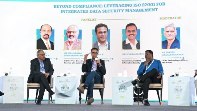 Expertos hablan en la sesión titulada ‘Más allá del cumplimiento: Aprovechamiento de ISO 27001 para la gestión integrada de la seguridad de datos’, en The Hindu Tech Summit 2026, en Chennai | Crédito de la foto: M. Srinath.