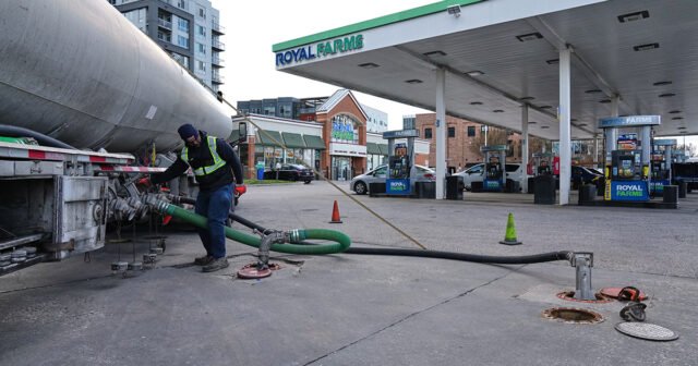Un conductor de camión cisterna entrega combustible a una gasolinera el 17 de marzo en Baltimore. (Stephanie Scarbrough/AP)