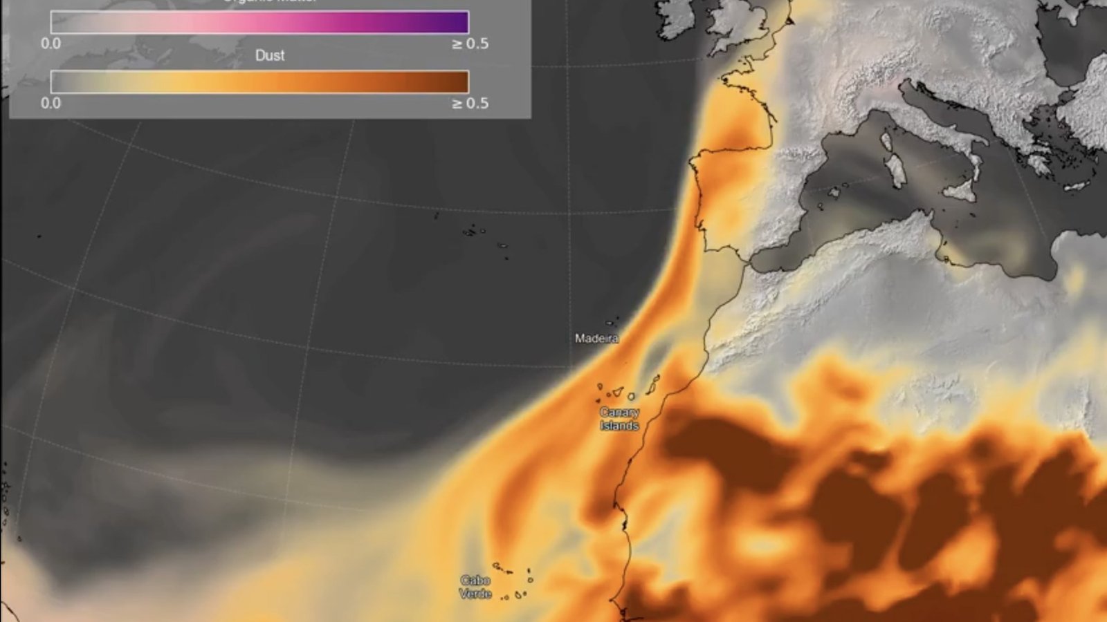 “Este sistema meteorológico de baja presión seguirá dirigiendo polvo hacia el Reino Unido en el sector cálido antes del frente frío”.