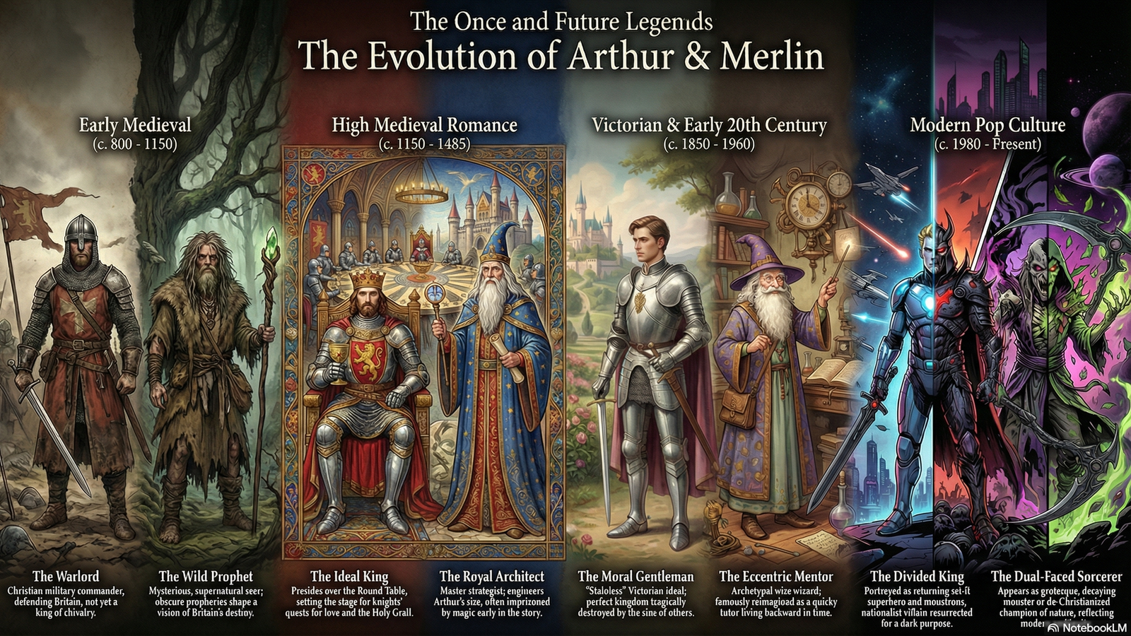 Para esta segunda infografía, quería un viaje a través de épocas históricas, mostrando cómo las apariencias y roles de Arturo y Merlín han evolucionado con el tiempo. Puedes ver la pareja repetida a lo largo de las épocas, luciendo muy diferentes cada vez y con un nuevo título y descripción cada vez. Las transiciones en el tiempo no son sólo visuales; son temáticos. Cada par refleja la política, la moral y la estética de la época. El hecho de que Nano Banana Pro consiguiera mantener la coherencia del personaje alternando entre el medievalismo y el cyberpunk es, francamente, destacable.