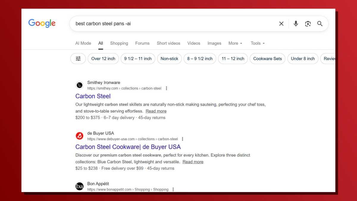 Método #1: Añade el -ai parámetro al final de cada consulta de búsqueda. Por ejemplo, si estoy buscando “los mejores utensilios de cocina de acero al carbono” y no quiero el resumen de IA, puedo buscar best carbon steel pans -ai. Al momento de escribir este artículo, Google todavía respeta este parámetro de búsqueda.