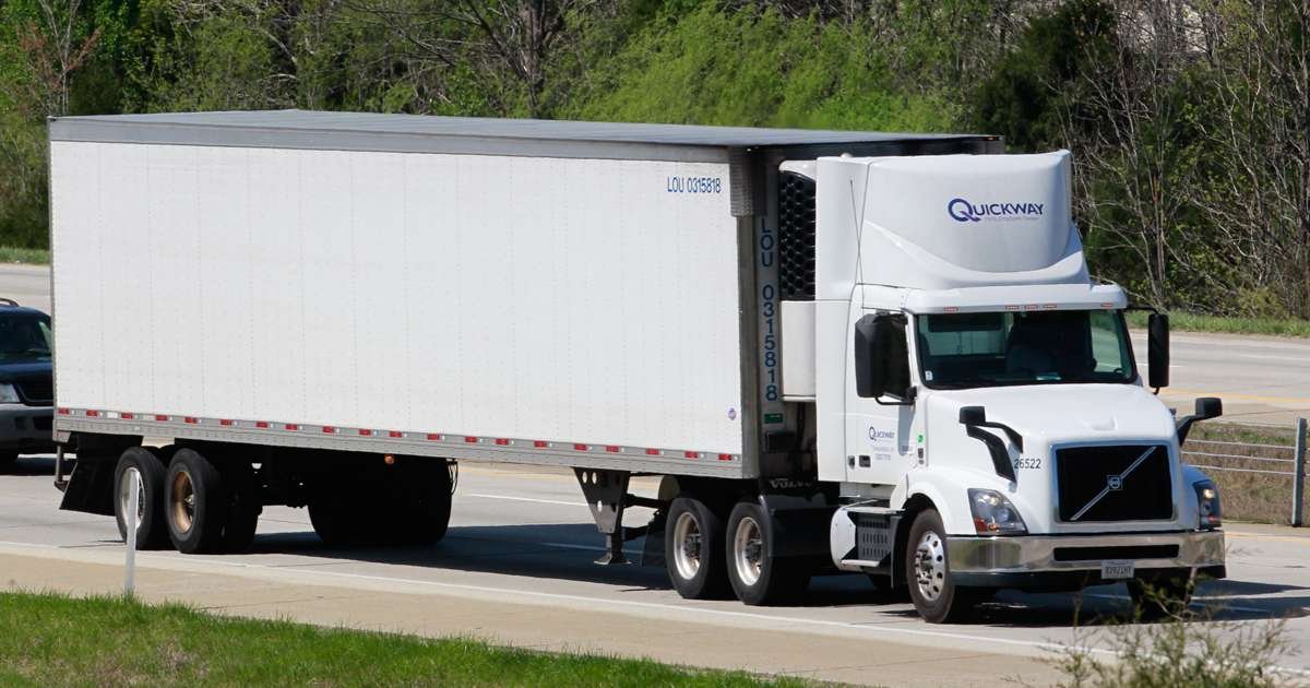 Un camión con remolque Quickway circula por la Interestatal 65 en Kentucky en 2018. (John Sommers II para Transport Topics)