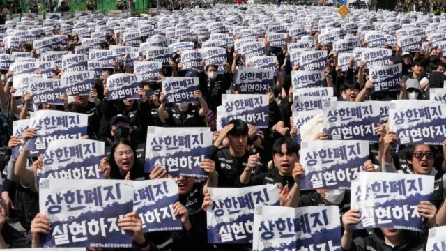 “No detendremos esta lucha hasta que se cumplan nuestras justas demandas”, dijo Choi Seung-ho, líder sindical, por un altavoz encima de una estructura montada sobre una grúa.