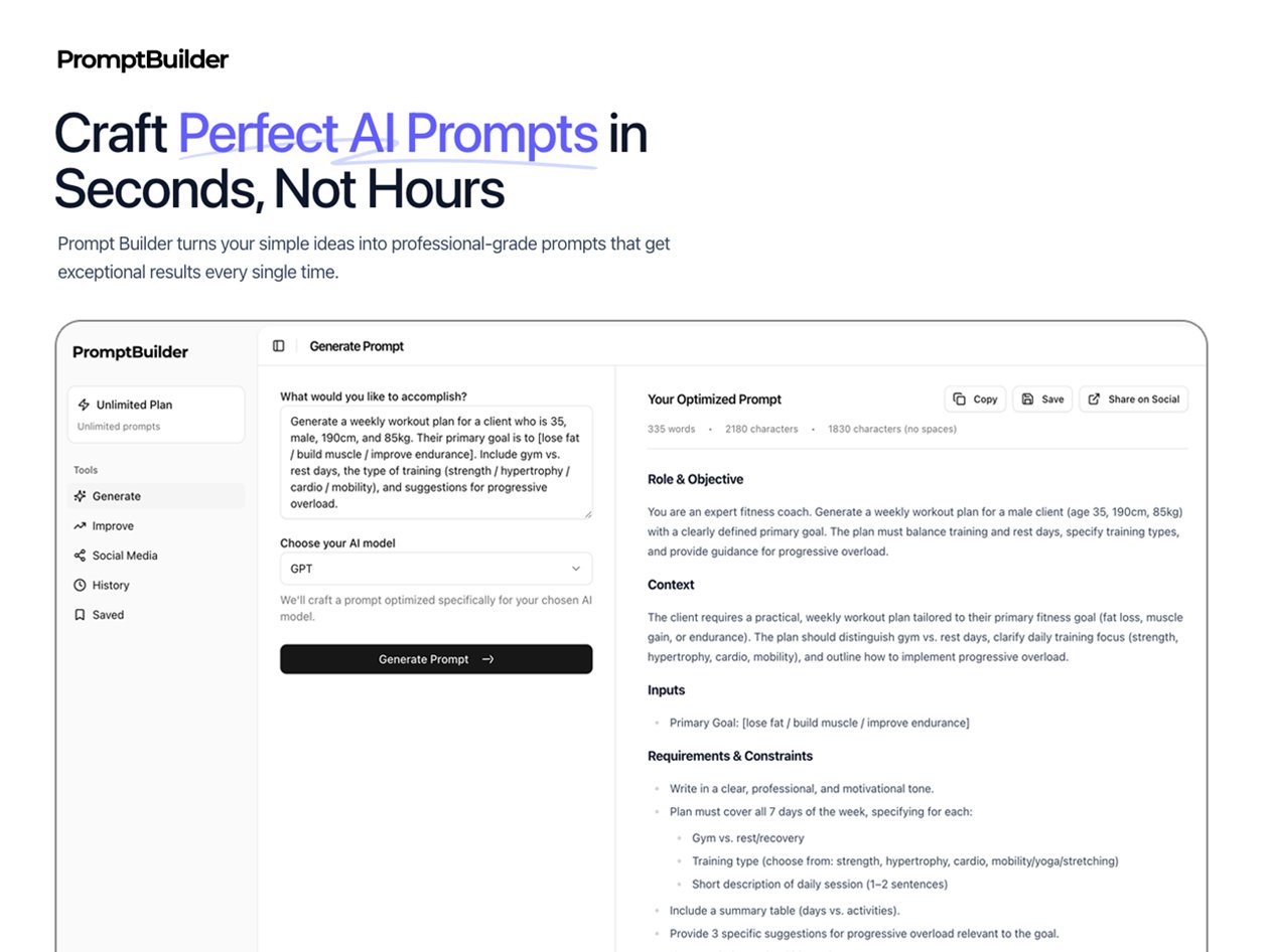 Cualquiera que use Herramientas de IA A menudo te encuentras con el mismo problema: la idea está clara en tu cabeza, pero el modelo te sigue dando algo fuera de lugar. PromptBuilder intenta reducir este ida y vuelta. Explica lo que está intentando hacer y lo convierte en un mensaje más claro y directo que funciona en ChatGPT, Claude, Gemini y varias otras plataformas.
